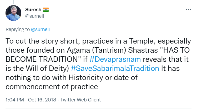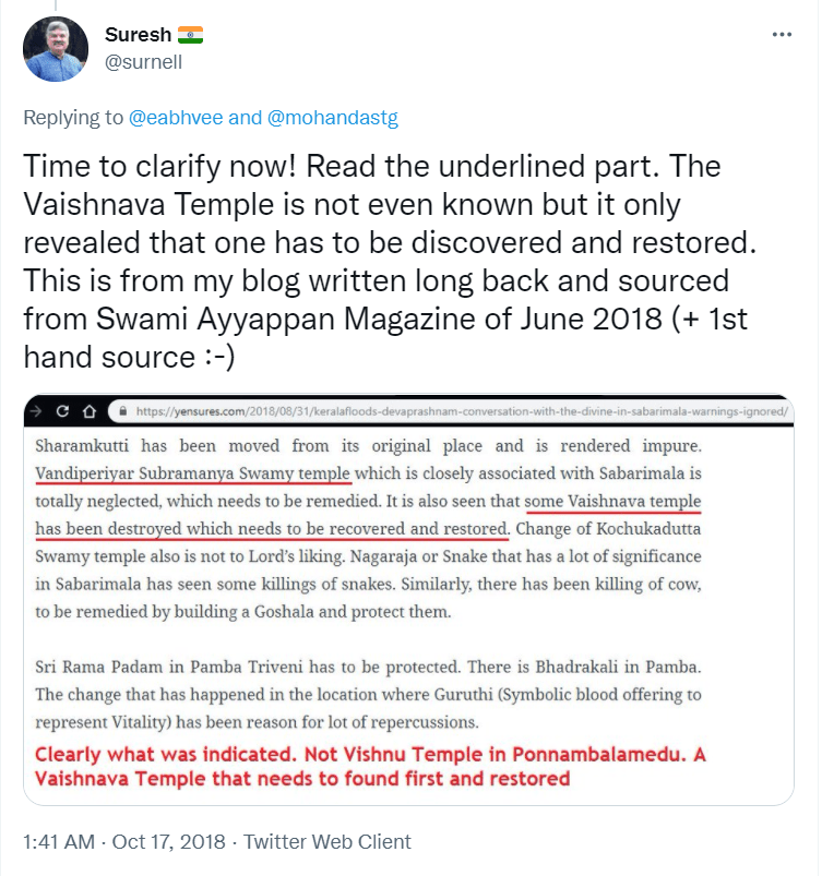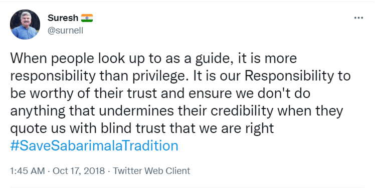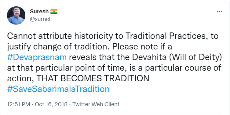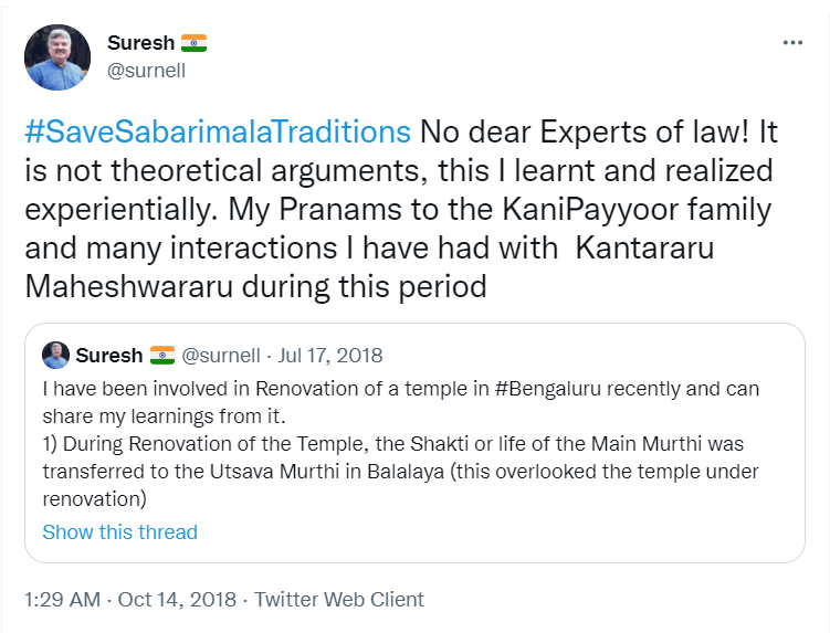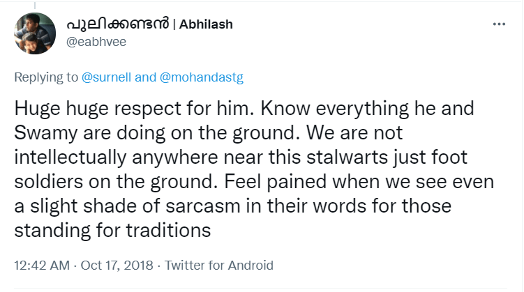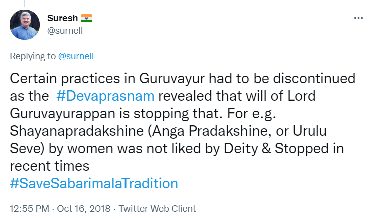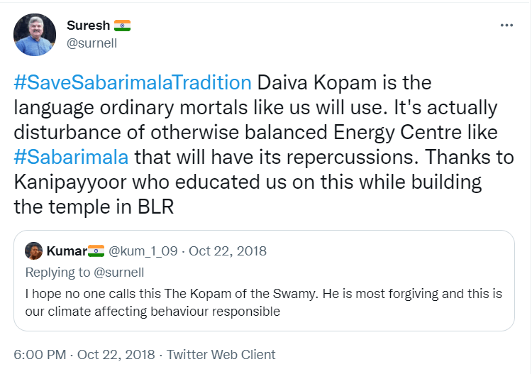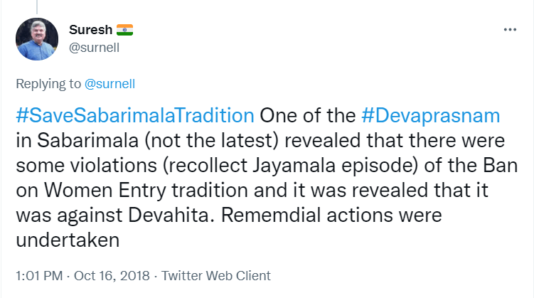 To understand the logic behind the age old practice in Sabarimala, all the readers are requested to go through the Blog Site maintained by a highly educated woman, Maitri by name, engaged in the research of menstrual periods of women for the past nine years. She is very popular in Karnataka through her educating mission. Her write up remains highly welcome, informative and reformative among all classes of women, possessing the stamp of personal experience. The Women Liberation Activists (who are verily professionals) fighting for equality in the matter of Sabarimala Darshan should definitely go through her Blog Site to feel greatly rewarded. The link to her Blog Site is given hereunder for everyone’s enlightenment and the accruing benefit thereafter. https://mythrispeaks.wordpress.com/2018/10/23/sabarimala-verdict-fabricated-rights-over-real-experiences-of-women/amp/?__twitter_impression=true
